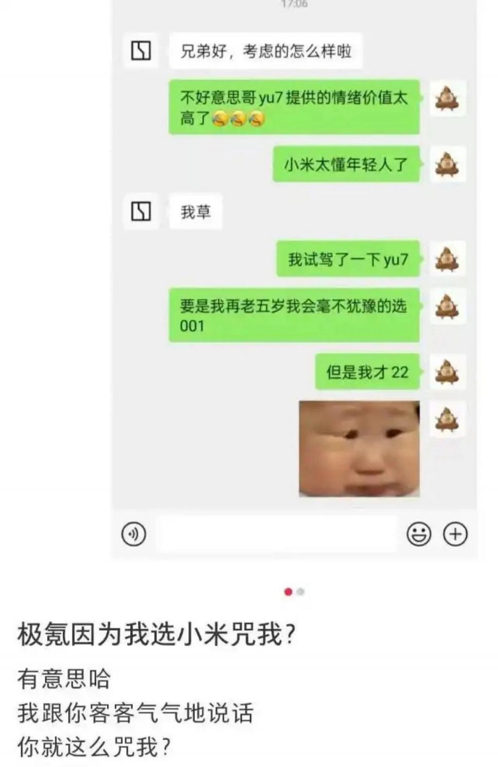 这场闹剧始于一次平和的咨询。22 岁的顾客在极氪门店坦言:“小米 YU7 的情绪价值太懂年轻人,再老 5 岁我肯定选极氪 001 ”。没想到这番“彩虹屁 + 真心话”,竟触发极氪销售的“攻击性技能”。